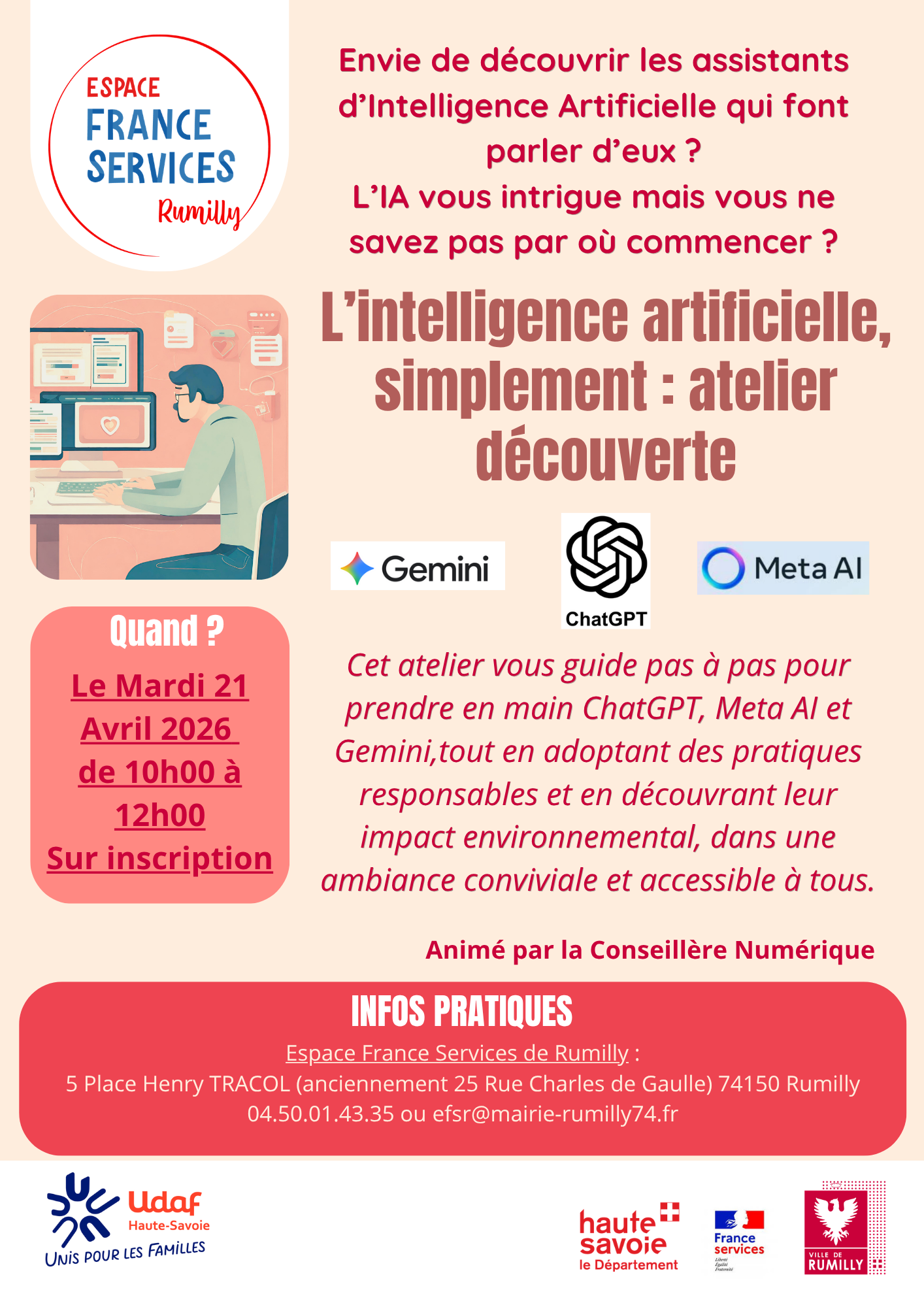 Participez à l’ atelier numérique proposé par notre Conseillère Numérique de l’ UDAF 74, pour comprendre simplement ce qu’est l’IA, comment elle fonctionne et surtout comment bien l’utiliser au quotidien en ayant conscience de son impact et des ses risques.